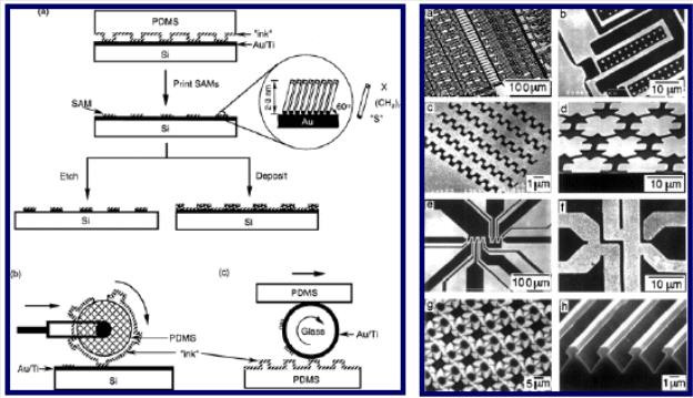 Перенос изображения со штампа. Технология основана на методе микроконтактного печатания и обеспечивает высокую точность. Используемые для печати растворы можно менять, также можно составлять библиотеки готовых образцов и быстро их наносить.