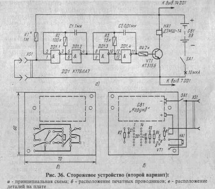 На рис. 36,а приведена схема второго варианта сторожевого устройства, которое обладает еще большей экономичностью: потребляемый в дежурном режиме ток не превышает 10 мкА, т. е. срок службы батареи питания определяется в основном ее саморазрядом. Это оказалось возможным благодаря применению высокоэкономичной микросхемы серии К176.