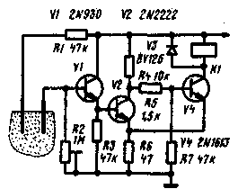 Устройство состоит из эмиттерного повторителя на транзисторе V1 и триггера Шмидта (транзисторы V2 и V4). Исполнительным механизмом управляет электромагнитное реле К1. Датчиками влажности служат два металлических или угольных электрода. погруженные в грунт.