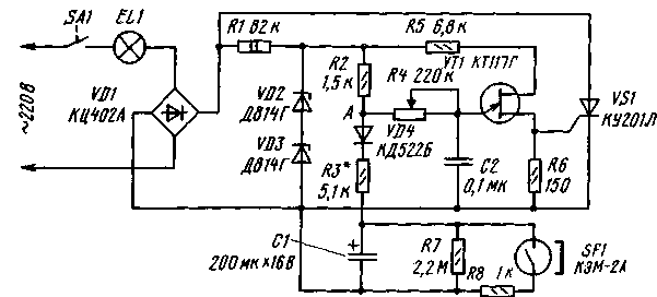 Тринистор КУ201Л заменим на КУ201К, М, КУ202Л-Н. Диод VD4 - любой из серий КД522, КД521, КД503. Все постоянные резисторы - МЛТ, переменный резистор R4 -СПЗ-4а. Конденсатор С1 - оксидный К50-6, С2 - любой малогабаритный.