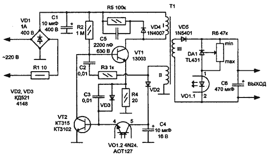 Для гальванической развязки выходного напряжения от сетевого использует­ся оптрон VOL Рабочее напряжение для транзисторной части оптрона берет­ся от обмотки II трансформатора Т1 и сглаживается конденсатором С4. Как только напряжение на выходе устройства станет больше номинального, через стабилитрон DA1 начнет течь ток, светодиод оптрона загорится, сопротивле­ние коллектор-эмиттер фототранзистора VOL2 уменьшится, транзистор VT2 приоткроется и уменьшит амплитуду напряжения на базе VT1.