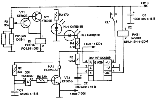 Резистор Rl — типа СПЗ-4 или аналогичный, с линейной характеристикой изменения сопротивления. Все постоянные резисторы R2—R6 типа МЛТ-0,125 и МЛТ-0,25. Оксидные конденсаторы типа К50-29 или аналогич­ные. Светодиоды любые с током 5...8 мА, например, АЛ307БМ. Транзисторы VT1, VT2 типа КТЗ107А — КТЗ107Ж или аналогичные. Транзистор VT3 лю­бой кремниевый, малой и средней мощности структуры n-p-п, например, КТ603, КТ608, КТ605, КТ801, КТ972, КТ940 с любым буквенным индексом. Реле Kl, К2 на напряжение срабатывания 8—12 В и ток до 30 мА. Реле К2, кроме того, должно обладать особыми свойствами коммутационных контак­тов, т. е. рассчитанное на напряжение коммутации не менее 250 В и ток не менее 1 А. Пьезоэлектрический капсюль может быть любым, рассчитан­ным на напряжение 4—20 В постоянного тока, например FMQ-2015D, FXP1212,KPI-4332-12.