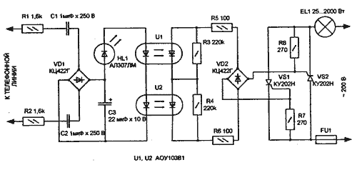 Когда поступает вызывной сигнал, тиристорные части оптронов открывают­ся, через диодный мост VD2 и управляющие электроды тиристоров VS1, VS2 начинает протекать ток, достаточный для того, чтобы тиристоры открылись, что будет сопровождаться зажиганием лампы EL1.