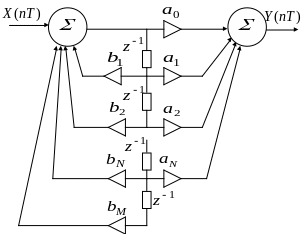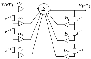 Уравнение, связывающее входные и выходные величины для рекурсивного фильтра, имеет вид: