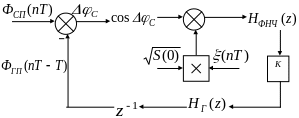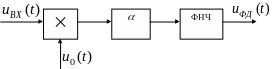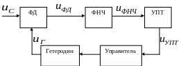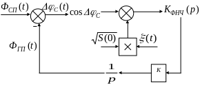 , с помощью которого происходит перестройка гетеродина от частоты свободных колебаний в разомкнутой системе на частоту сигнала. ФНЧ ослабляет высокочастотные составляющие напряжения, управляющего частотой гетеродина, и корректирует передаточную функцию замкнутой системы.