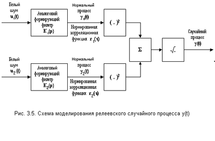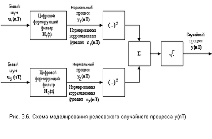 при этом являются в свою очередь независимыми нормальными процессами. Таким образом, моделирование случайного процесса с релеевской плотностью вероятности может осуществляться по схеме рис 3.5 и ее цифровому аналогу рис. 3.6. Здесь в каждой схеме, в отличие от схем рис. 3.1 и рис. 3.2 используется по два формирующих фильтра, на входы которых поступают реализации независимых белых гауссовых шумов