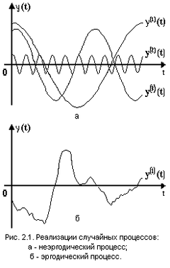 . Этот факт иллюстрируется на рис. 2.1, где а - реализации случайного процесса, генерируемого в соответствии с (2.33), а б - реализация эргодического процесса. Моделирование с использованием случайного процесса, не являющегося эргодическим, может потребовать большего времени, так как для достоверной статистической оценки его воздействия на моделируемую систему или устройство необходимо произвести большое количество испытан