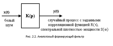 Если формирование значений моделируемого случайного процесса в произвольные, заранее неизвестные моменты времени не является необходимым, то применение методов канонических и неканонических разложений нецелесообразно и можно воспользоваться более экономичными методами, основанными на идее формирующего фильтра (рис. 2.2, 2.3). На рис. 2.2 представлена схема формирования из белого шума