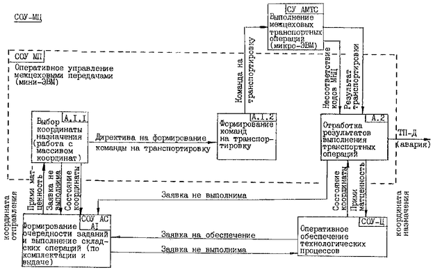 Система управления АМТС, в соответствии с полученной командой на транспортировку реализует заданный координатой назначения маршрут передвижения и по его окончании формирует сообщение «Результат транспортировки» или «Несоответствие кодов материальных ценностей». После начала транспортировки СОУ МП извещает склад об освобождении координаты отправления, формируя сообщение «Состояние координаты». После завершения транспортировки СОУ МП извещает цех, формируя сообщение «Прими материальную ценность». При изменении состояния какой-либо из координат, используемых при организации межцеховых передач, СОУ цехов (складов) извещают об этом СОУ МЦ (массив координат) формируя сообщение «Состояние координаты». При возникновении внепрограммных, аварийных ситуаций управление передается на телетайп диспетчеру - сменному инженеру (блок А.2).