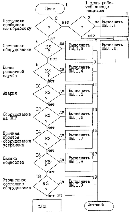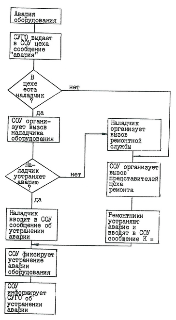 Рассмотрим теперь алгоритм решения одного из программных модулей ФМ-4, например, ПМ.1.5. «Вызов ремонтной службы при аварийна оборудовании». Блок-схема неформализованного алгоритма представлена на рис.4.2.4.