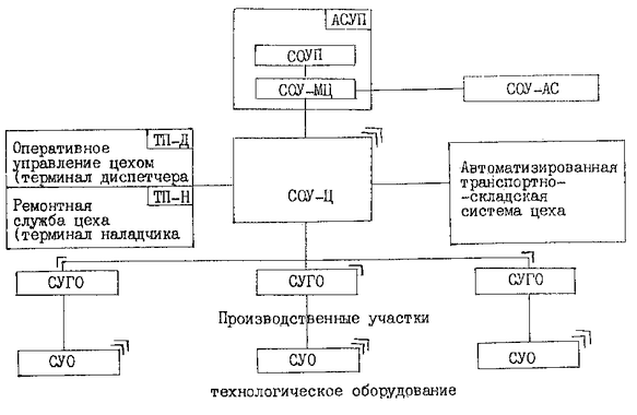 Система управления цехом является ключевым и наиболее сложным звеном в общей иерархии ТАПЭМ. Напомним, что в соответствий с кибернетической концепцией цех разделяется на управляющую систему (управляющий вычислительный комплекс) и управляемую (производственный процесс). Организационно-технологическое управление цехом рассмотрим на примере цеха сборки электронных модулей [7].
