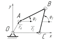 Найдем положение точек В, С и S2, а также углы наклона звеньев 2 и 3 с положительным направлением оси Х в зависимости от обобщенной координаты.