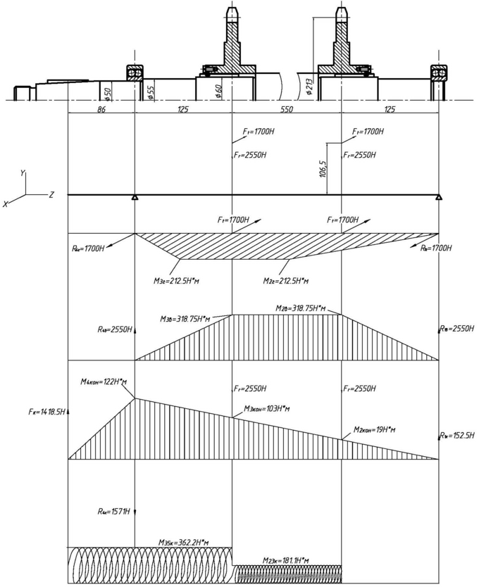 При составлении расчетной схемы учитываем, что условная шарнирная опора для радиального подшипника расположена в середине ширины подшипника.