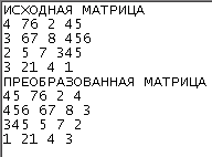 3. Выполнить задачу, используя вложенные операторы цикла, и вывести файл массив заново, предварительно напечатав строку: ПРЕОБРАЗОВАННАЯ МАТРИЦА:
