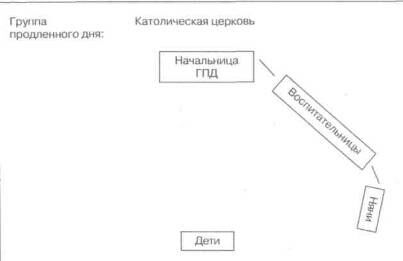 Мы беседовали о живых, развитых организмах, таких как люди, семьи, животные и группы животных, стаи, племена, говорили о растениях, которые хорошо растут только рядом с определенными видами других растений, о прудах, лесах и болотах. Дети, разбившись на подгруппы, искали формы проявлений, к которым подходит понятие «организм», и заодно находили критерии, характеризующие организации. Я была очень удивлена тем, как много они могли сказать на эту тему. Нарисовав по собственной инициативе структуру семьи, ребята тут же начали чертить структурные схемы школы и класса, которые оказались самыми интересными (подробнее об этом дальше). Некоторые ребята принесли схемы, на которых их отцы изобразили структуру фирмы, была у нас и одна схема группы продленного дня.