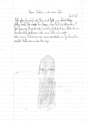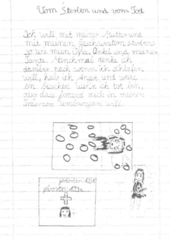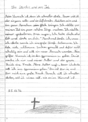 Я хочу, чтобы я поскорее умерла. Но до этого я хочу быть очень милой и отзывчивой девочкой и принести нескольким людям счастье. До своей смерти я хотела бы сделать несколько прекрасных вещей. Я хотела бы сказать моей умершей бабушке: «Я тебя очень люблю и помню о тебе». Иногда я думаю, что, когда я умру, я буду сильно наказана. Я сделала много плохих вещей и за это не виновата и хочу стать новым человеком. Больше всего я хочу пойти в гимназию. Этим я доставлю радость себе и моей маме и всей семье. Моя мама говорит: «Прежде чем я умрууя должна пойти в гимназию». Это для нее и для меня большая радость. После этого я хочу поскорее умереть, потому что я хочу знать, как там, на небесах.