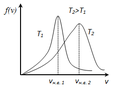 , следовательно, с ростом температуры наиболее вероятная скорость растёт, но площадь S, ограниченная кривой функции распределения остаётся неизменной, так как из условия нормировки