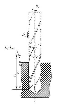 (lвр — величина врезания сверла, для сверл с двойной заточкой lвр +lпод = 0,5∙d;