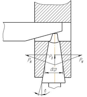 При выборе № конуса Морзе необходим расчет на момент, который он может передать на И. Момет рассчитывают по осевой нагрузке. Осевое усилие Ро, действующее вдоль оси инстумента, раскладываем на две силы, силы, действующие в радиальном направлении, взаимно уничтожаются. Рассмотрим силу PN, которая действует нормально к образующей конуса.