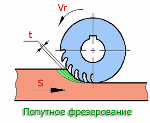 Попутное фрезерование производится при совпадающих направлениях вращения фрезы и движения обрабатываемой заготовки в месте их контакта.