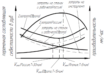 Европа: степень автоматизации и стоимость станков и рабочей силы высокие. Оптимальная скорость резания ниже, чем в Японии. Т=15мин.