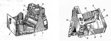 Рис.18. ВПХР: 1 — корпус; 2 — крышка; 3 — ручной насос; 4 — кассеты с индикаторными трубками; 5 — противоарозольные фильтры; 6 — насадка; 7 — защитные колпачки; 8 — фонарь; 9 — грелка; 10 — патроны к грелке; 11 – лопатка; 12 — инструкция-памятка по работе с прибором; 13 — инструкция по обнаружению фосфорорганических ОВ; 14 — плечевой ремень.