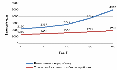 В первые 10 лет ежегодный темп роста потребных размеров переработки будет составлять 3 %, а в последующие 10 лет – 9 % от начальных размеров переработки. Темп роста транзитных поездов составляет 2 % от исходных.