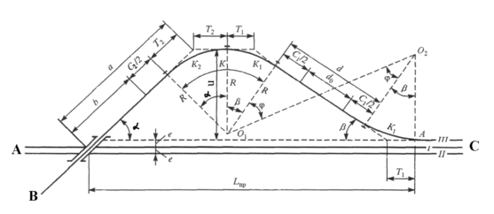 При расчете путепроводной развязки в плане определяются следующие элементы: угол поворота