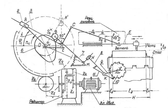 Строгальный станок предназначен для строгания плоских по­верхностей. Привод станка состоит из электродвигателя планетарного редуктора и зубчатой передачи (Z5, Z6) (рис. 1 – 1). Резание материала производится резцом, закрепленным в резцовой головке, совершающей возвратно-поступательное движение. Для дви­жения резца, укрепленного в суппорте ползуна 5, используется шестизвенный кривошипно-кулисный механизм, состоящий из кривошипа 1, кулисного ползуна 2, вращающейся кулисы 3, шатуна 4, ползуна 5. Силы сопротивления, приложенные к звену 5, показаны в виде диаграммы (PC5 , SD ) на рис. 1 – 2. Ход Н ползуна 5 выбирается л зависимости от длины обрабатываемой детали lД с учетом длины перебегов резца lП в начале и в конце рабочего хода. Средняя скорость резания VРЕЗ выбирается в зависимости от условий об­работки. Во время перебегов в конце холостого и в начале рабо­чего ходов осуществляется перемещение стола (на котором закреп­ляется обрабатываемая деталь) с помощью ходового винта на вели­чину поперечной подачи (на рис. 1 – 1 не показано).Поворот этого винта производится посредством кулачкового механизма, состоящего из кулачка 6 и коромыслового толкателя 7, а также храпового механизма, состоящего из звеньев 8 и 9, храпового колоса 10 и собачки 11. Кулачок 6 закреплен на одном валу с кривошипом 1. Регулирование подачи стола производится изменением количества зубьев, захватываемых собачкой 11.