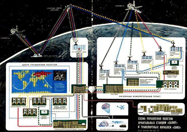 Управление полетом Базового блока осуществлялся из советского Центра управления полетами - ЦУП-М (г. Королев Московской обл.). Причем передача команд была возможна через наземные станции слежения, а также через спутники-ретрансляторы.