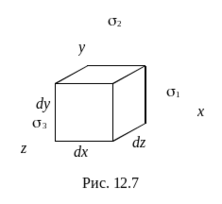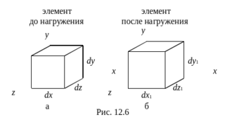 Из ненагруженного тела вырежем элемент в виде элементарного параллелепипеда со сторонами dx, dy, dz (рис. 12.6а). Объем этого элемента равен dV = dx dy dz.