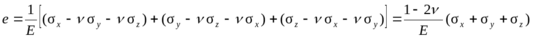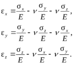 Просуммировав деформации по оси x от всех трех напряжений, получим результирующую деформацию ex. По аналогии запишем деформации ey, ez