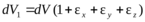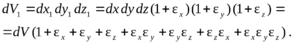 Линейная деформация e очень мала по сравнению с единицей. Обычно e это величина порядка 10-3 в наших задачах. Произведение e на e мало по сравнению с e. Так что четыре последних члена в предыдущем выражении - это малые высшего порядка, ими пренебрегаем. Тогда объем элемента после нагружения тела равен