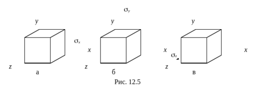 Запишем подробно линейную деформацию по оси x, создаваемую каждым нормальным напряжением отдельно (рис. 12.5а, 12.5б, 12.5в). Только от растягивающего напряжения sx по оси x возникает продольная деформация растяжения