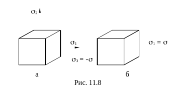 , то два главных напряжения равны нулю, а третье нулю не равно. Это одноосное напряженное состояние (рис. 11.10).