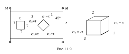 Возможен частный случай двухосного напряженного состояния, когда два главных напряжения равны по величине и противоположны по знаку. Такое напряженное состояние называется чистый сдвиг. В частности при кручении бруса возникает напряженное состояние чистый сдвиг. Под углом в ±45° к оси закрученного бруса возникают только нормальные напряжения, а касательные напряжения отсутствуют. Значит, эти площадки главные. Нормальные напряжения в этих площадках численно равны касательному напряжению, возникающему в поперечном сечении, одно из них растяжение, это smax = t, а другое сжатие, это smin = -t (рис. 11.9).