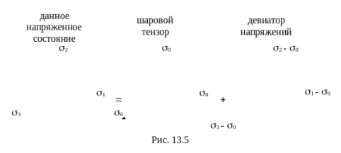 Любое напряженное состояние можно представить как сумму двух напряженных состояний (рис. 13.5). Одно из этих состояний - трехосное равное растяжение, которое называется шаровым тензором. Второе напряженное состояние, которое дополняет шаровой тензор до исходного напряженного состояния, называется девиатором напряжений. Шаровой тензор соответствует только изменению объема тела без изменения его формы при любом значении напряжения