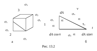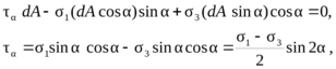Из равновесия этого клиновидного элемента получим выражение ta через главные напряжения, где ta это касательное напряжение, действующее в площадке, расположенной под углом a к главной оси 1. Площадь наклонной площадки обозначена через dA, тогда площадь площадки 1 будет dA cosa, а площадь площадки 3 будет dA sina.