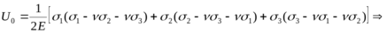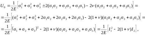 Удельную потенциальную энергию деформации U0 тоже можно представить как состоящую из двух частей. Одна часть, Uоб - это удельная потенциальная энергия деформации, затраченная только на изменение объема тела. Эта энергия накоплена в шаровом тензоре. Другая часть, Uф, относящаяся к девиатору напряжений при