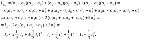 Выведем формулу для Uф - потенциальной энергии изменения формы. Эта формула потребуется нам в дальнейшем. Чтобы получить выражение для Uф надо в формулу (4) вместо I1 и I2 поставить инварианты девиатора I1D и I2D. Первый инвариант девиатора равен нулю (I1D = 0), тогда удельная потенциальная энергия изменения формы равна