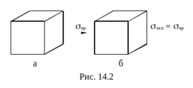 Теперь рассмотрим предельное одноосное сжатие хрупкого материала, представленное на рис. 14.3а, и эквивалентное ему одноосное растяжение, рис. 14.3б.