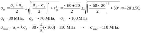 Площадка z, в которой отсутствует касательное напряжение, является главной площадкой и одно из главных напряжений это sz = -100 МПа. Два других главных напряжения определим из приведенной ниже формулы. Определяя главные напряжения, ставим в формулу нормальные напряжения, действующие в неглавных площадках, т.е. в тех площадках, где есть t. В данном примере это площадки x, y. Кроме того, сжимающее напряжение будет со знаком минус:
