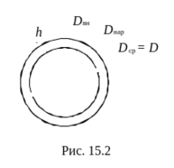 Рассмотрим тонкостенную цилиндрическую оболочку, изображенную на рис. 151. Толщина h этой оболочки намного меньше её диаметра D. Поэтому в силу тонкостенности можно считать, что наружный диаметр такой оболочки Dнар и её внутренний диаметр Dвн равны среднему диаметру