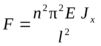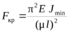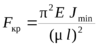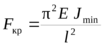 Поскольку критическая сила - это наименьшее значение нагрузки, при котором возможна криволинейная форма устойчивого равновесия, то из всех значений аргумента следует выбрать наименьшее: al = p или n =1. Мы рассматривали критическое состояние стойки, значит F = Fкр. Если стойка закреплена во всех направлениях одинаково, она будет выгибаться в плоскости наименьшей жесткости, поэтому следует принять Jx = Jmin. Получается