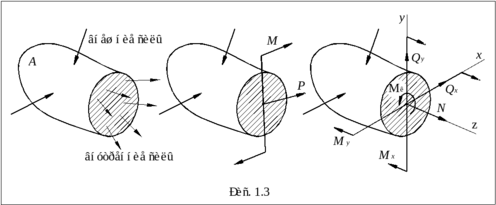Рассмотрим некоторое тело, к которому приложена система внешних сил, удовлетворяющих условиям равновесия, рис. 1.2. Отделим мысленно плоскостью от тела часть В. В полученном сечении части А приложим распределенные силы, заменяющие действие отброшенной части В на оставшуюся часть А (рис.1.3). Это внутренние силы, возникающие в рассматриваемом сечении. В другом сечении система внутренних сил будет другая.