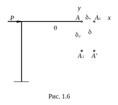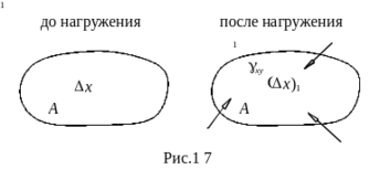 В точке А ненагруженного тела проведены две взаимно перпендикулярные оси x и y, рис. 1.7. На оси x выделен отрезок длиной Dx. После нагружения тела изменились его размеры и форма. Так отрезок Dx стал (Dx)1, ось y переместилась в положение y1, и первоначально прямой угол между осями x и y изменился на величину gxy.