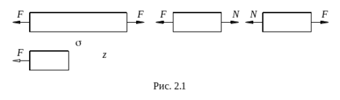 Величина осевой силы определяется с помощью метода сечений. Осевая сила N равномерно распределена по сечению в виде нормальных напряжений