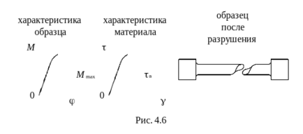 Для испытания материалов при кручении используют цилиндрический образец с квадратными головками (для захвата в испытательной машине). В процессе испытаний записывается характеристика образца - зависимость M = f (j). М - это нагрузка, т. е. момент, скручивающий образец, j - угол закручивания образца, рис. 4.5. Это характеристика образца определенным образом перестраивается и получается характеристика материала (или диаграмма материала при сдвиге) в координатах τ – касательное напряжение и γ – угол сдвига.