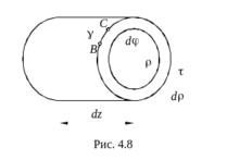 Из бруса, нагруженного моментами М, вырежем двумя поперечными сечениями элемент длиною dz (рис.4.7), а из этого элемента двумя цилиндрическими сечениями радиуса ρ и ρ+dρ выделим элементарную трубку, рис.4.8. Левый торец трубки условно закреплен.