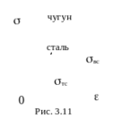 На рис. 3.11 приведены характеристики стали и чугуна при сжатии.
